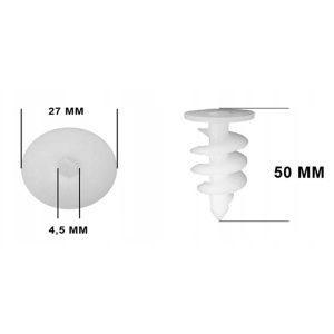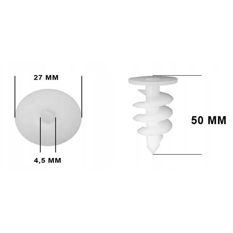 Wkręt spiralny 50 mm (bez haka) i średnicy 27mm został wykonany z wytrzymałego poliamidu, co zapewnia jego trwałość i niezawodność. Wyposażony w hak oczkowy o średnicy 4,5mm, wykonany ze stali galwanizowanej i ocynkowany, wkręt spiralny zyskuje solidność i dodatkową wytrzymałość.